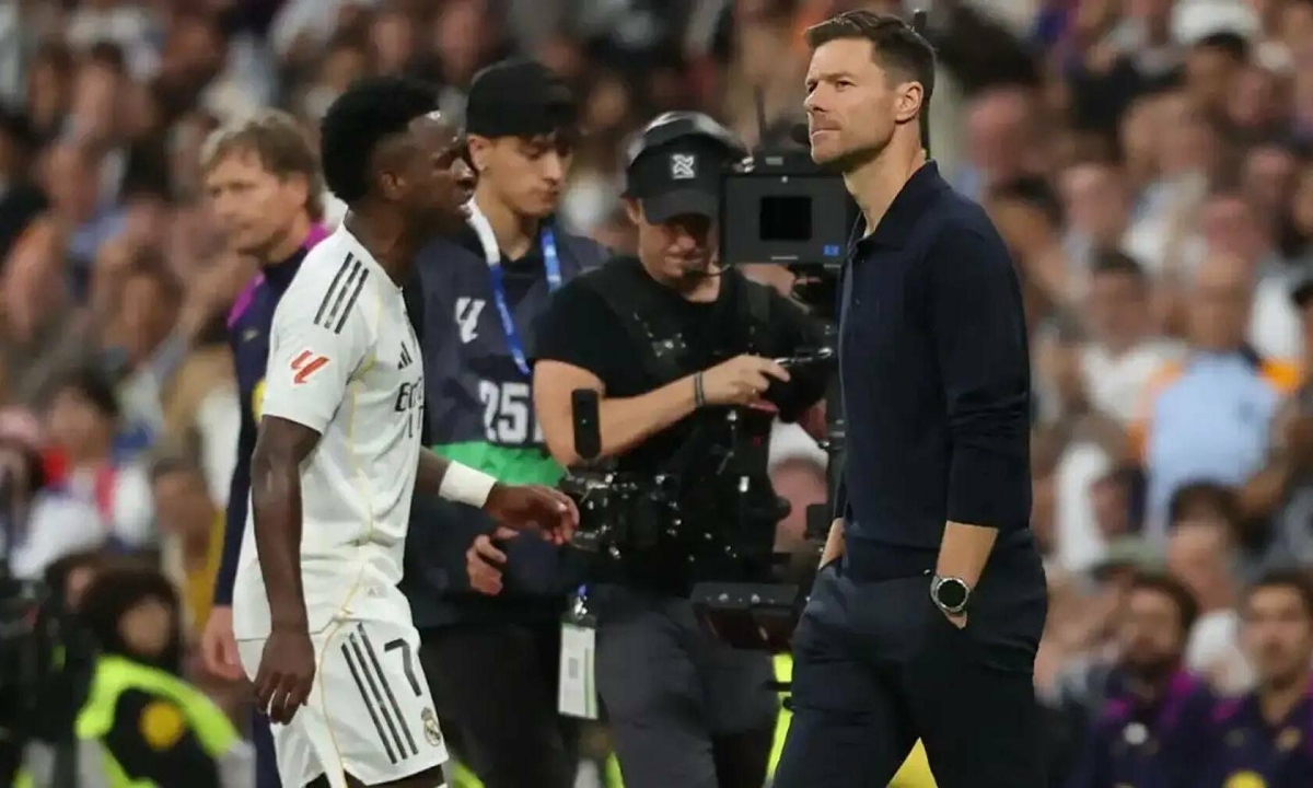 Vinicius (trái) phản ứng với HLV Alonso trong trận Real thắng Barca 2-1 ở La Liga hôm 26/10. Ảnh: EFE