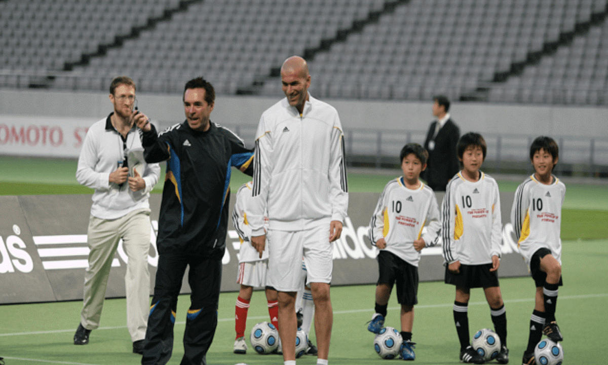 Tom Byer huấn luyện bóng đá cùng Zinedine Zidane ở một sự kiện của Adidas.