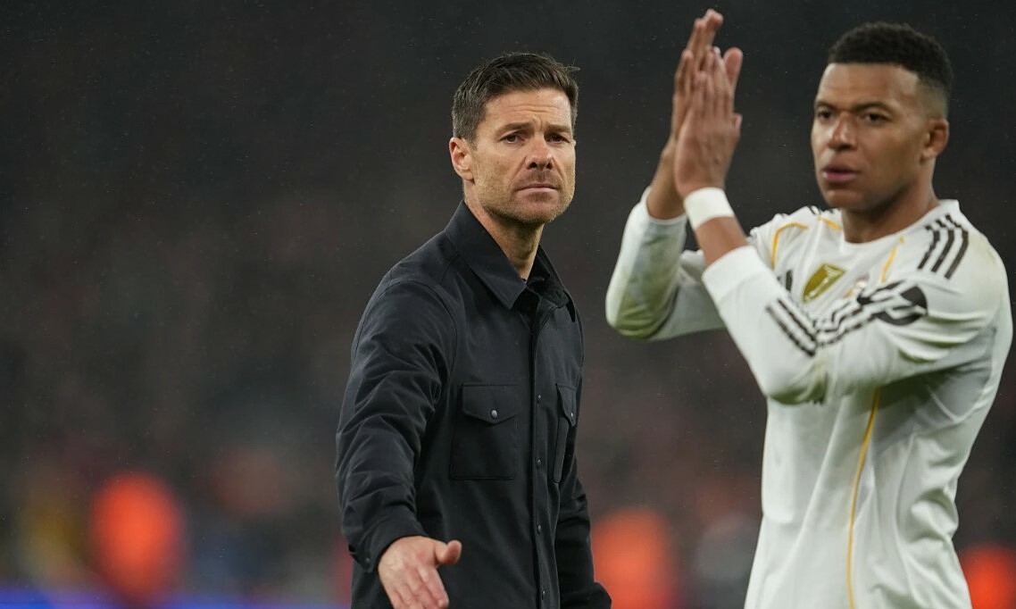 HLV Xabi Alonso (áo đen) và Kylian Mbappe sau trận Real thua Liverpool 0-1 trên sân Anfield, thành phố Liverpool, Vương quốc Anh, tại Champions League tối 4/11/2025. Ảnh: AP