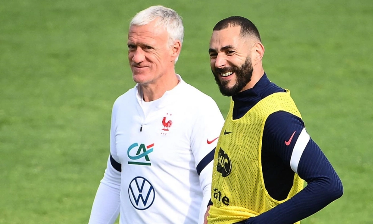 HLV Didier Deschamps (trái) và Karim Benzema trong một buổi tập của tuyển Pháp tại Clairefontaine trước thềm Euro 2020. Ảnh: AS