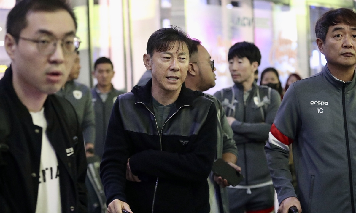 HLV Shin Tae-yong cùng đội tuyển Indonesia có mặt tại sân Nội Bài ngày 13/12/2024, hai ngày trước trận gặp Việt Nam tại vòng bảng ASEAN Cup 2024. Ảnh: Hiếu Lương