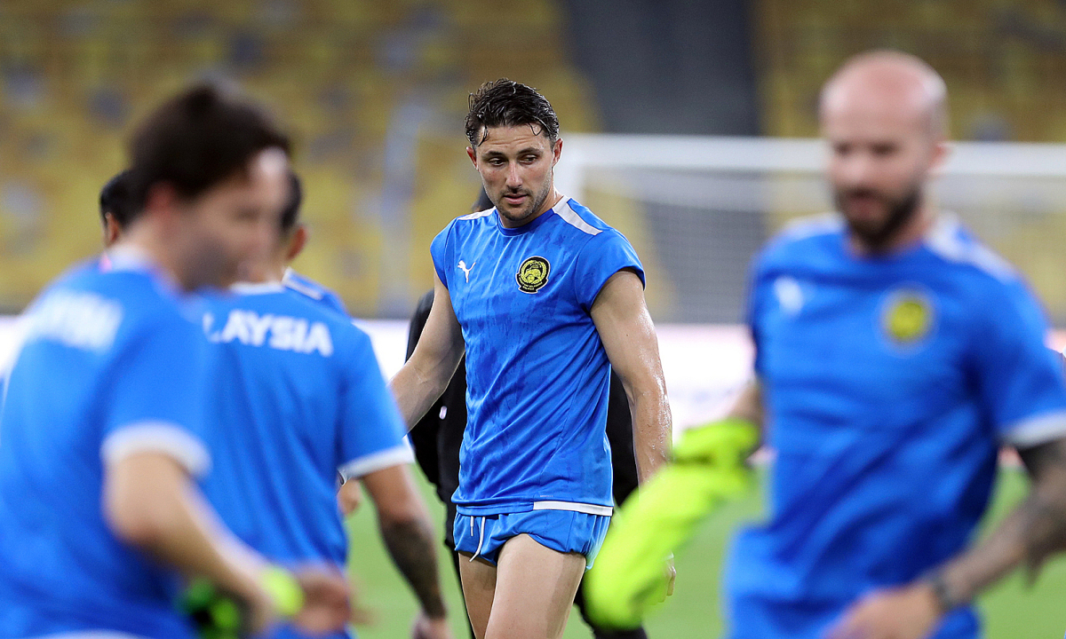 Trung vệ Malaysia gốc Argentina Facundo Garces (giữa), thuộc nhóm bảy cầu thủ bị FIFA phạt, tập luyện tại sân Bukit Jalil, Malaysia ngày 9/6/2025, trước trận gặp Việt Nam tại lượt hai bảng F vòng loại cuối Asịa Cup 2027. Ảnh: Hai Tư