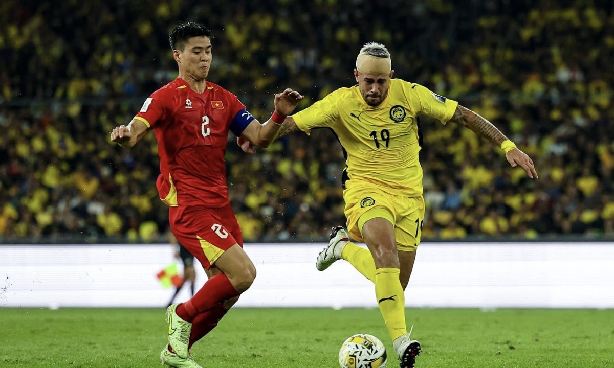 Nguyễn Hoàng Đức (áo đỏ phải) tranh chấp với tiền đạo Malaysia gốc Argentina Rodrigo Holgado trong trận Việt Nam thua Malaysia 0-4 ở lượt hai bảng F vòng loại cuối Asian Cup 2027, trên sân Bukit Jalil, Malaysia ngày 10/6/2025. Ảnh: Hai Tư