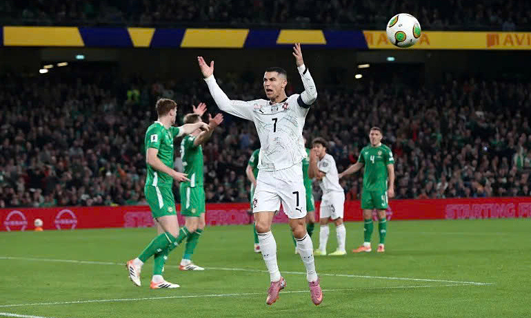 Phút 59, khi Bồ Đào Nha đang bị dẫn hai bàn, Ronaldo đánh nguội hậu vệ Dara O’Shea trong cấm địa chủ nhà, bằng cách thúc khuỷu tay vào lưng đối thủ. Khi O’Shea nằm sân, Ronaldo còn làm động tác giả khóc để chế giễu cầu thủ này.
