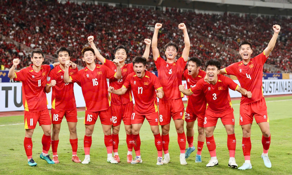 Các cầu thủ Việt Nam mừng chiến thắng 1-0 trước Indonesia ở chung kết U23 Đông Nam Á 2025, trên sân Gelora Bung Karno, Indonesia ngày 29/7/2025. Ảnh: Hai Tư