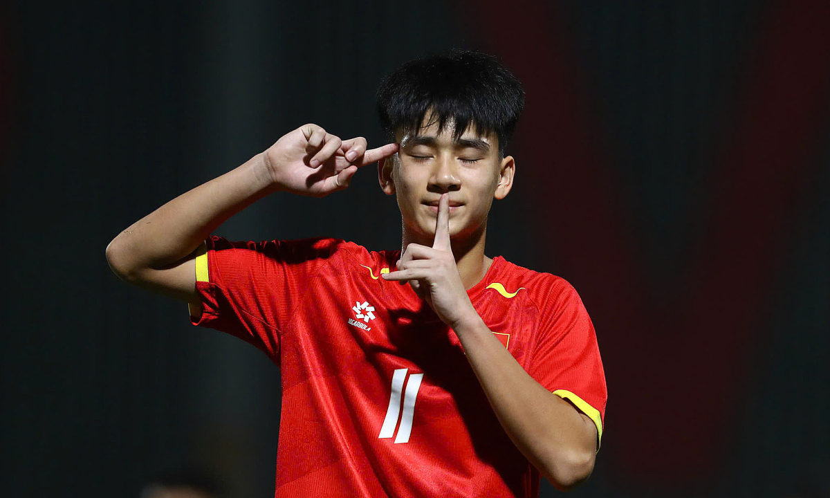 Tiền đạo Việt Nam Nguyễn Văn Dương lập cú đúp trong trận thắng Quần đảo Bắc Mariana 14-0 ở lượt hai bảng C vòng loại U17 châu Á 2026, trên sân PVF ở Hưng Yên ngày 24/11/2025. Ảnh: Như Huynh.